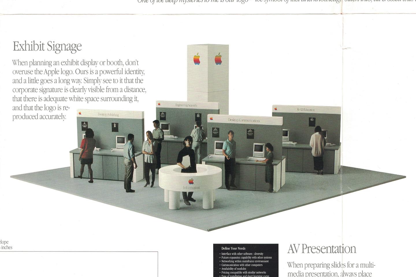 My copy of Apple’s Identity Guidelines was made in 1987, a year notable for Reagan’s “Mr. Gorbachev, tear down this wall!” speech in Berlin and the release of Bad by Michael Jackson. Only two years earlier, Steve Jobs had been ousted from Apple. A year before that in 1984, the first Macintosh was released. Another 7 years earlier in 1977 was when the now famous 6 color rainbow Apple logo first appeared.
