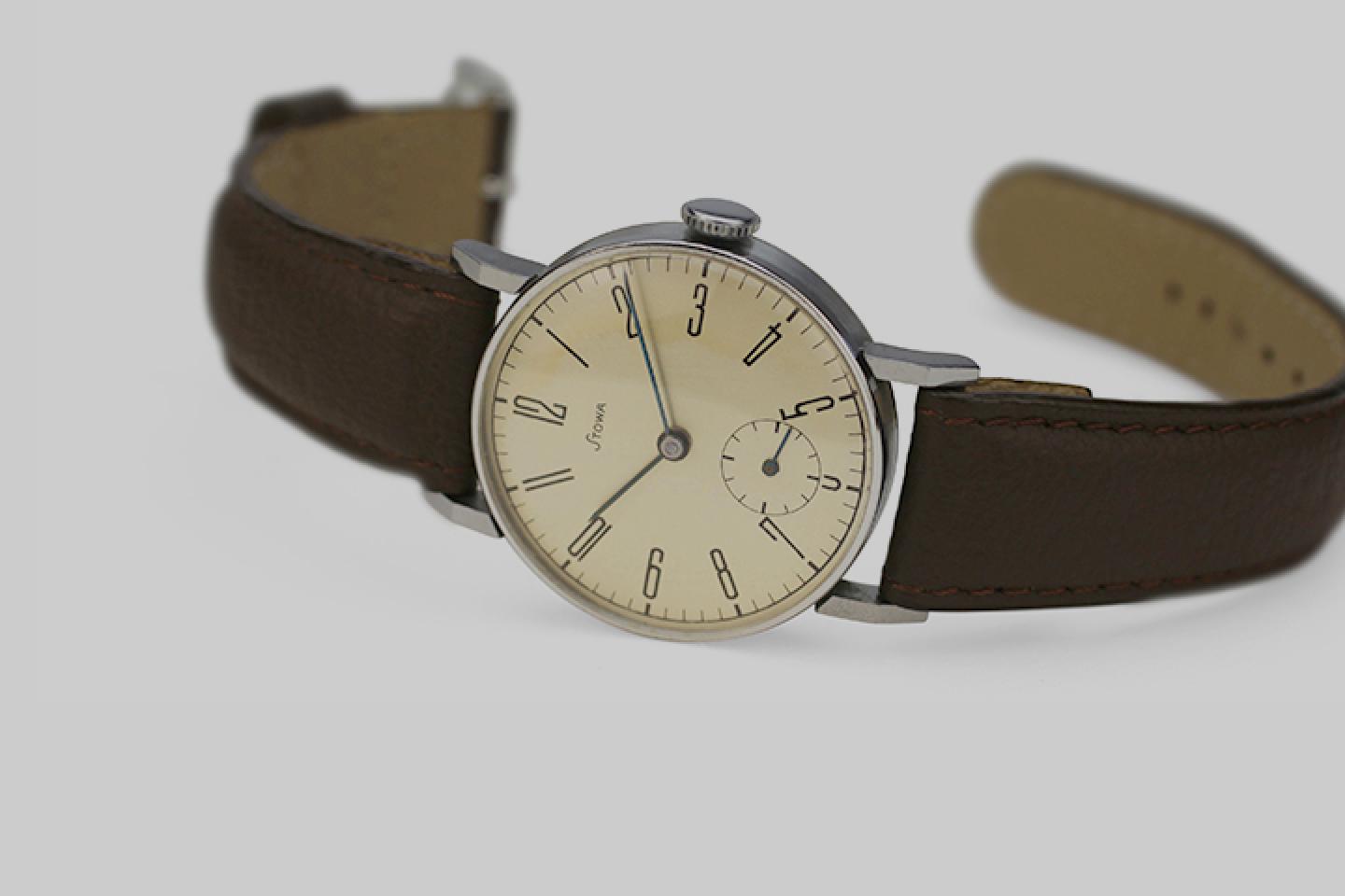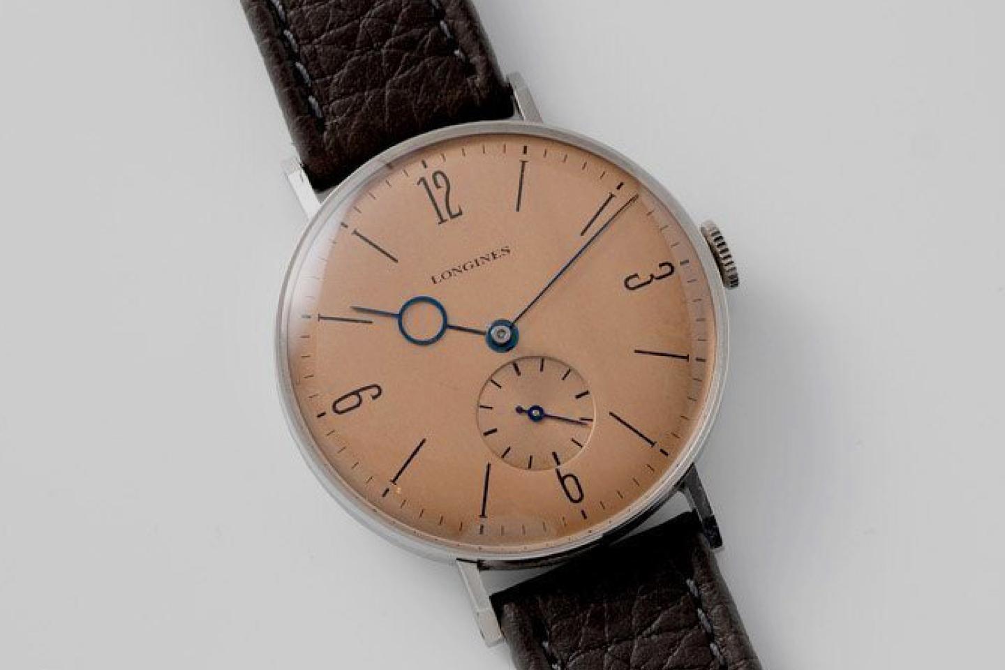The Bauhaus-inspired dial design found its way into many other watches in the 1930s and 1940s. Another example is this dial seen on 1940s Longines timepieces dubbed “Calatrava.” The one below has numerals at the four cardinal positions and straight markers on the rest.
