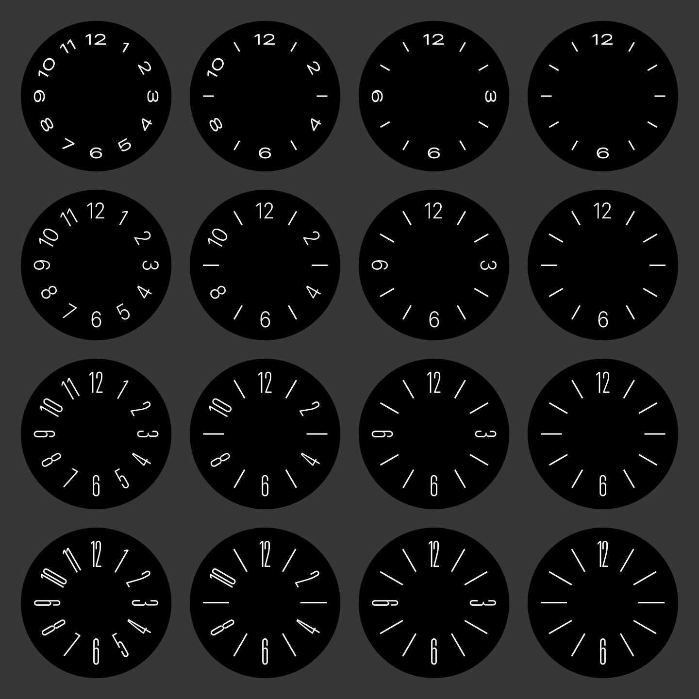 First of all, there are four different numeral arrangements. There’s one quite similar to the Stowa Antea with all twelve numerals. There’s one like the Lange and Tangente that has just even numbers. There’s also one with the cardinal numerals, and another with only twelve and six. There are also four different typographic variations, from wide to tall.