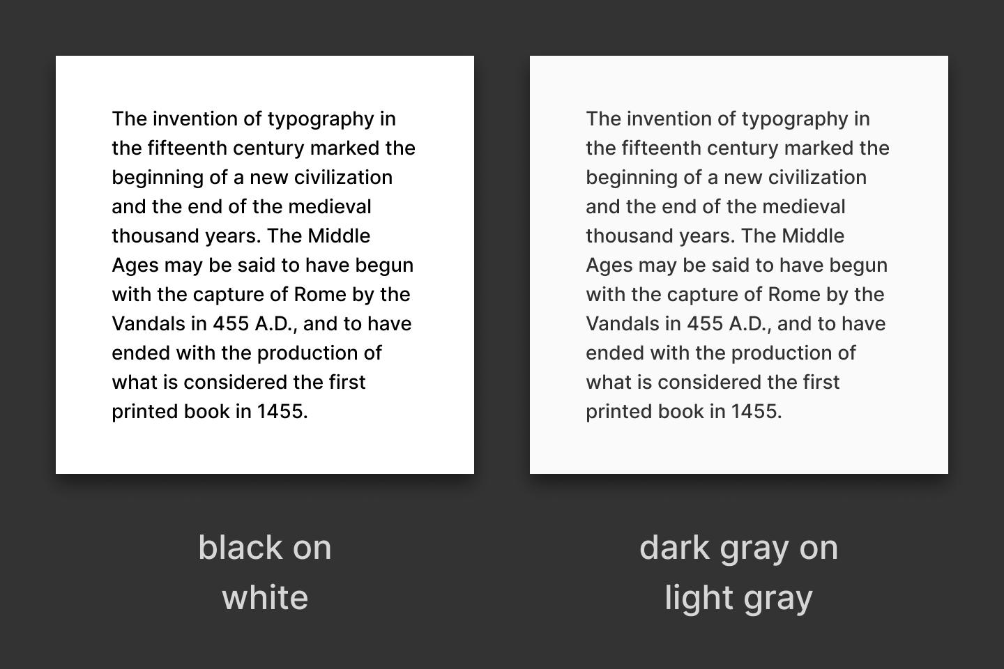 Like with typography, when it came to color, I prioritized readability as much as possible. There is research showing that using pure black and pure white can cause eye strain. If you look at a physical book or an e-reader like the Amazon Kindle, you’ll notice that neither the background nor the text is one hundred percent white or black. So, I selected a light gray color (2% black) that still looks almost white. Then I chose a darker color (80% black) for the copy.