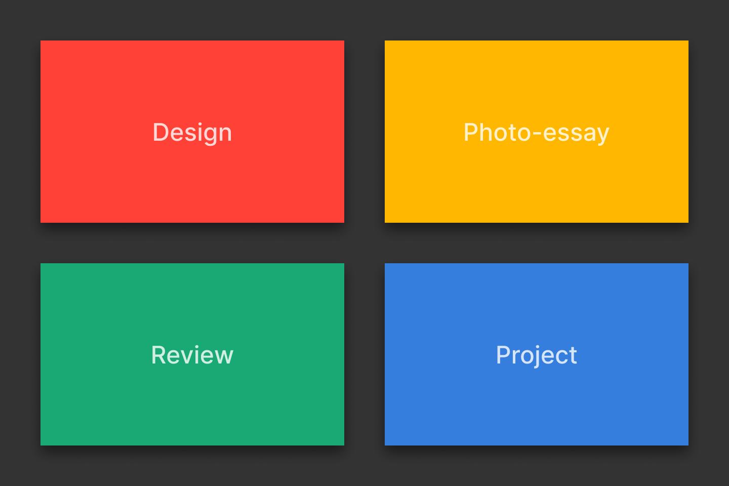 When it came to designing how each post would look, I wanted a sense of playfulness balanced with orderliness. So, I created color themes where each post would be a different color depending on its subject. I played around with a variety of different color palettes but ultimately chose a few colors from the Tachyons palette.