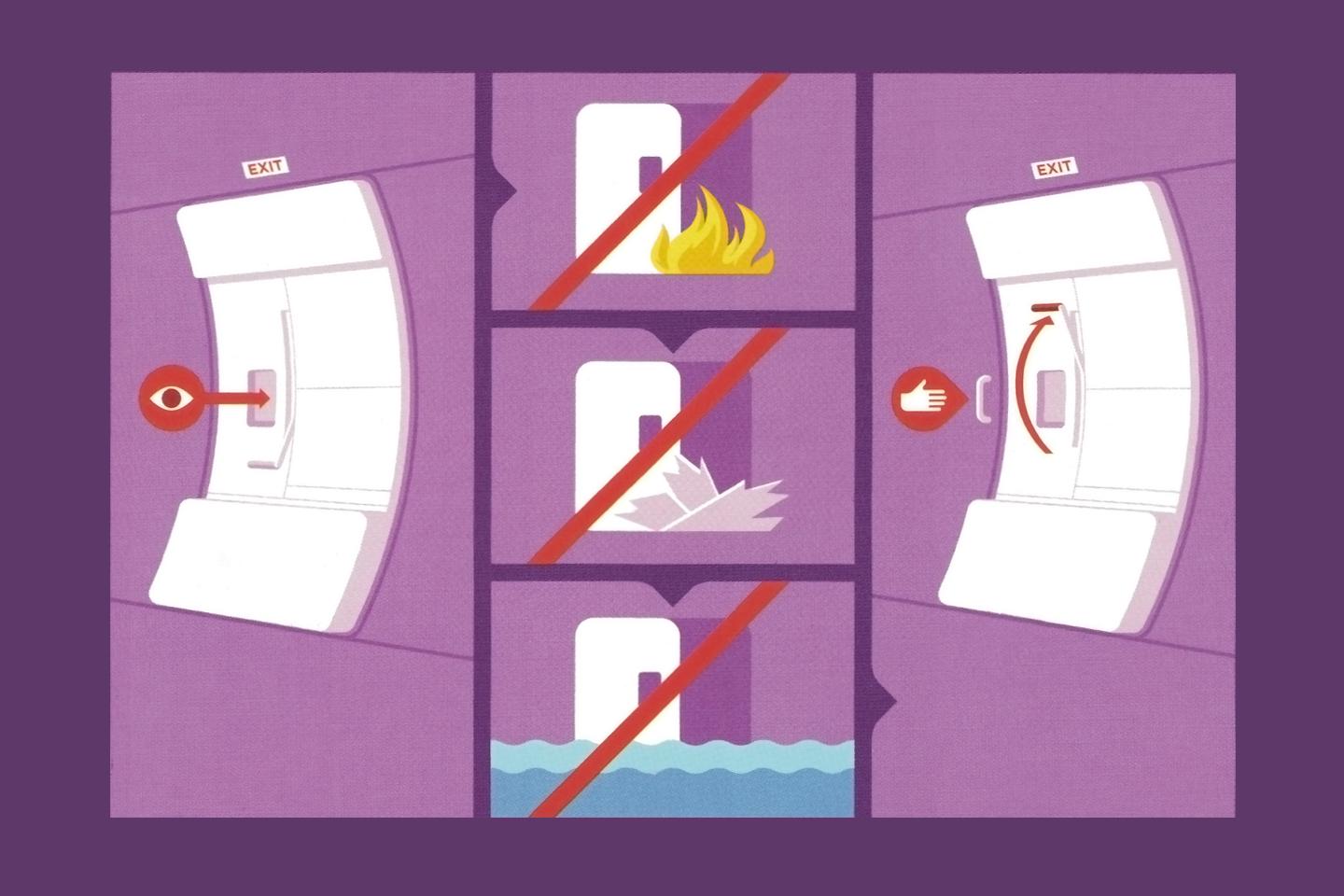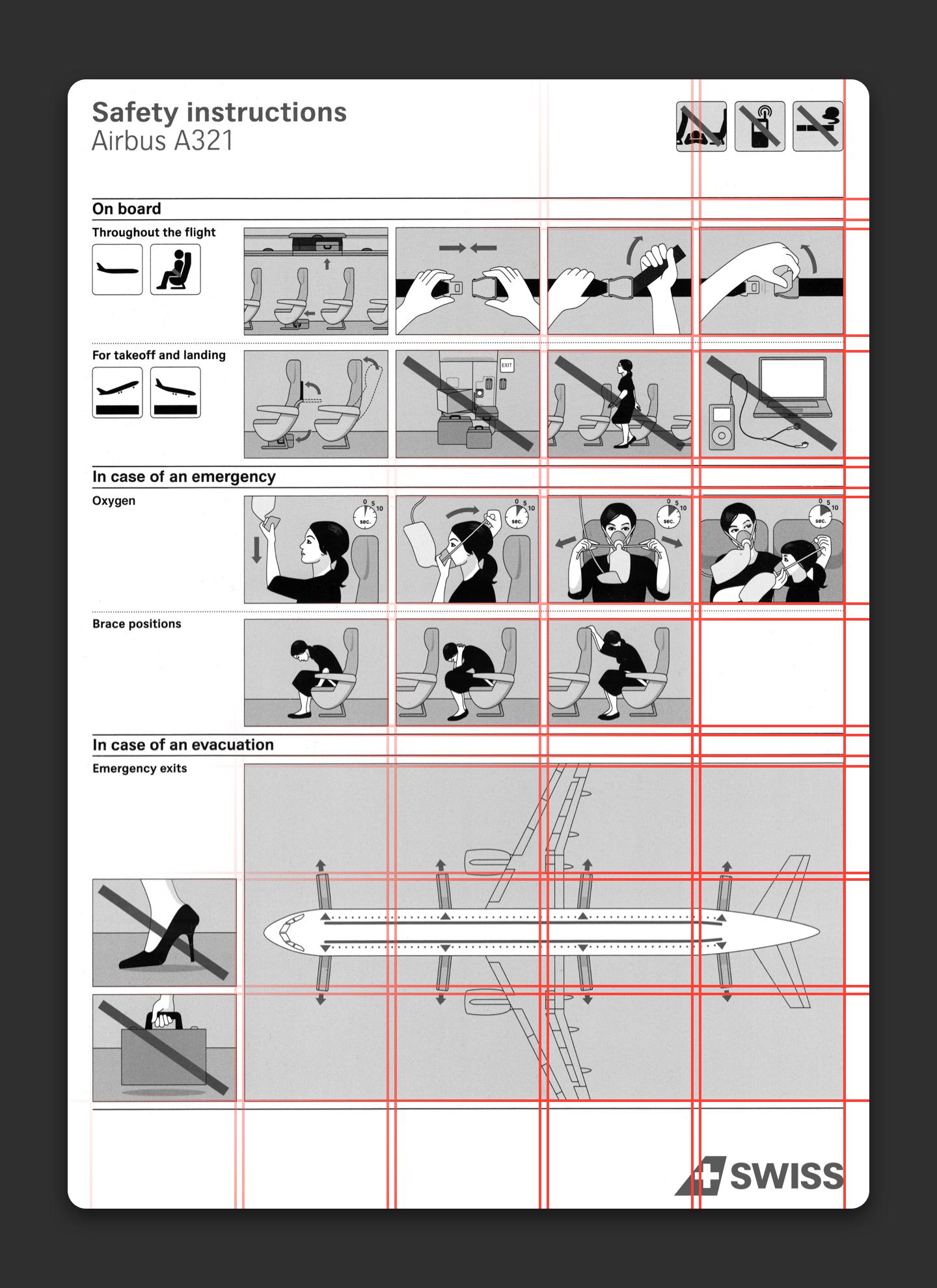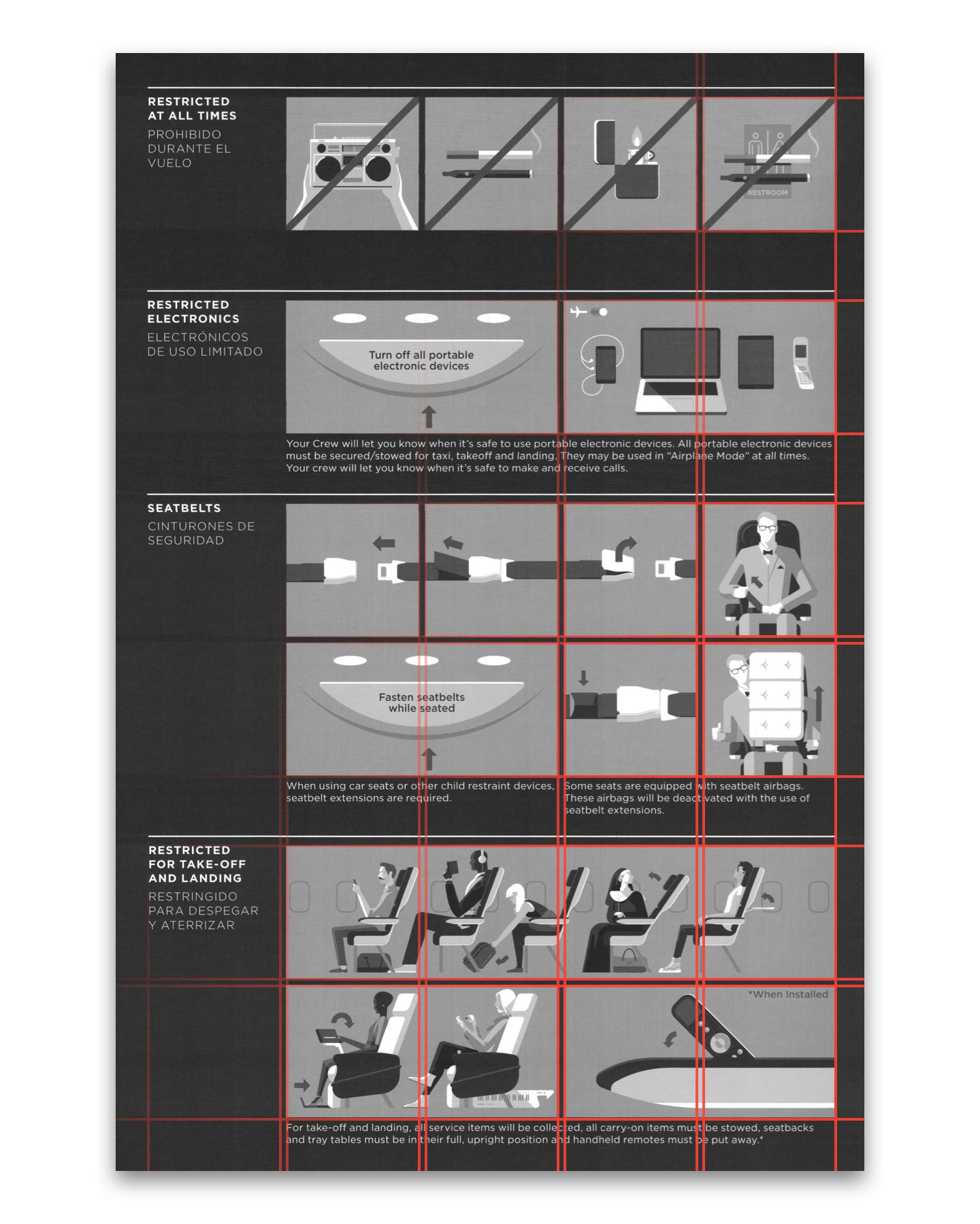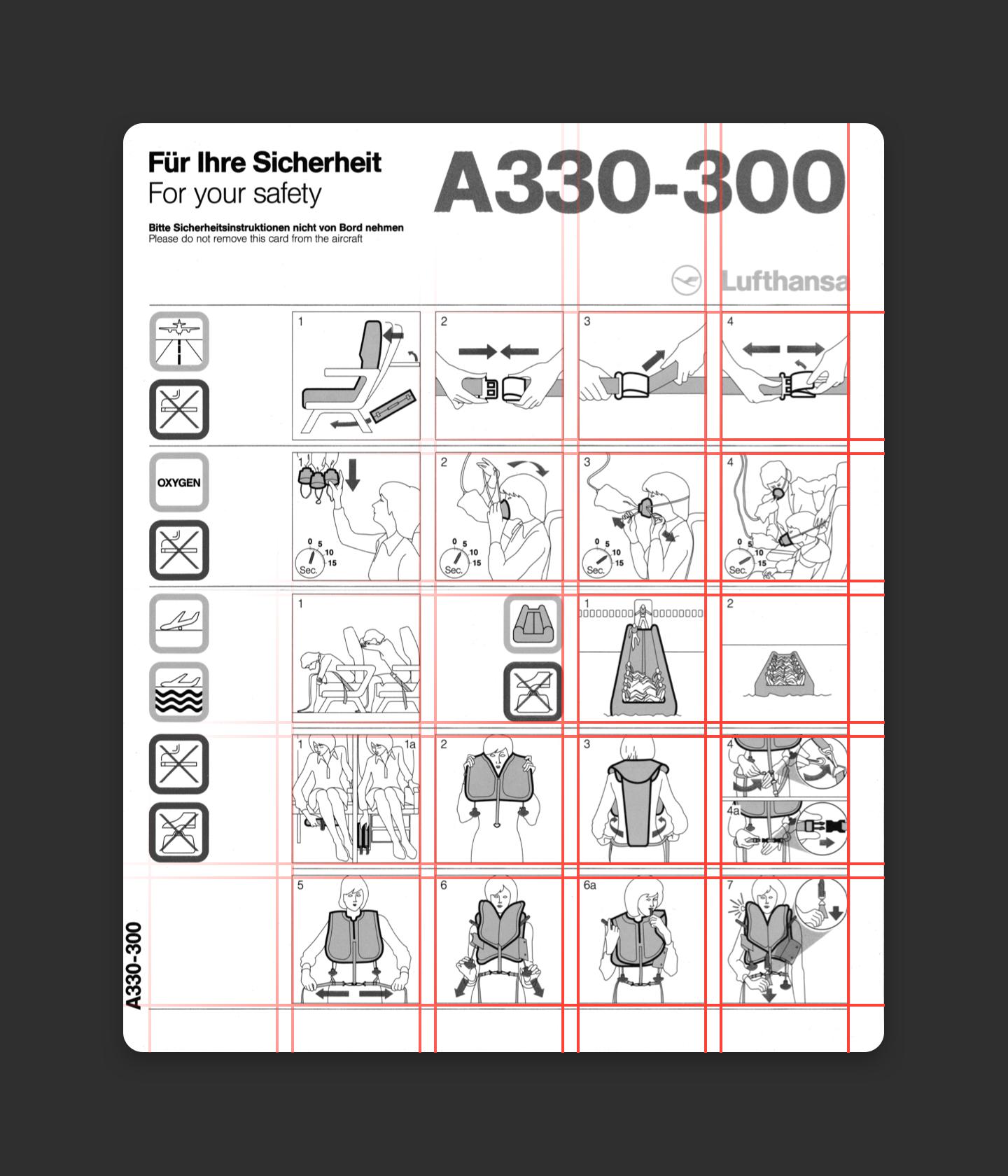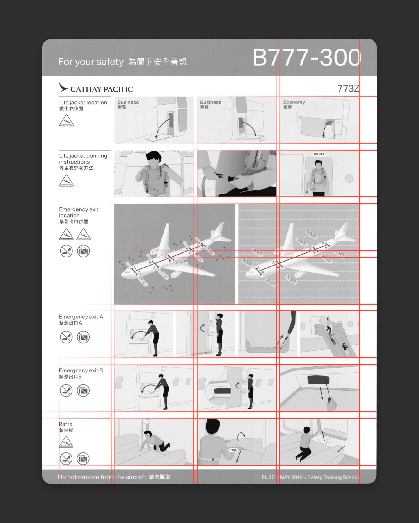 The first standout trait of a beautifully designed aircraft safety card is its layout. The card has to convey a tremendous amount of meaning but is only allotted a limited amount of space. This information density requires a carefully designed layout.