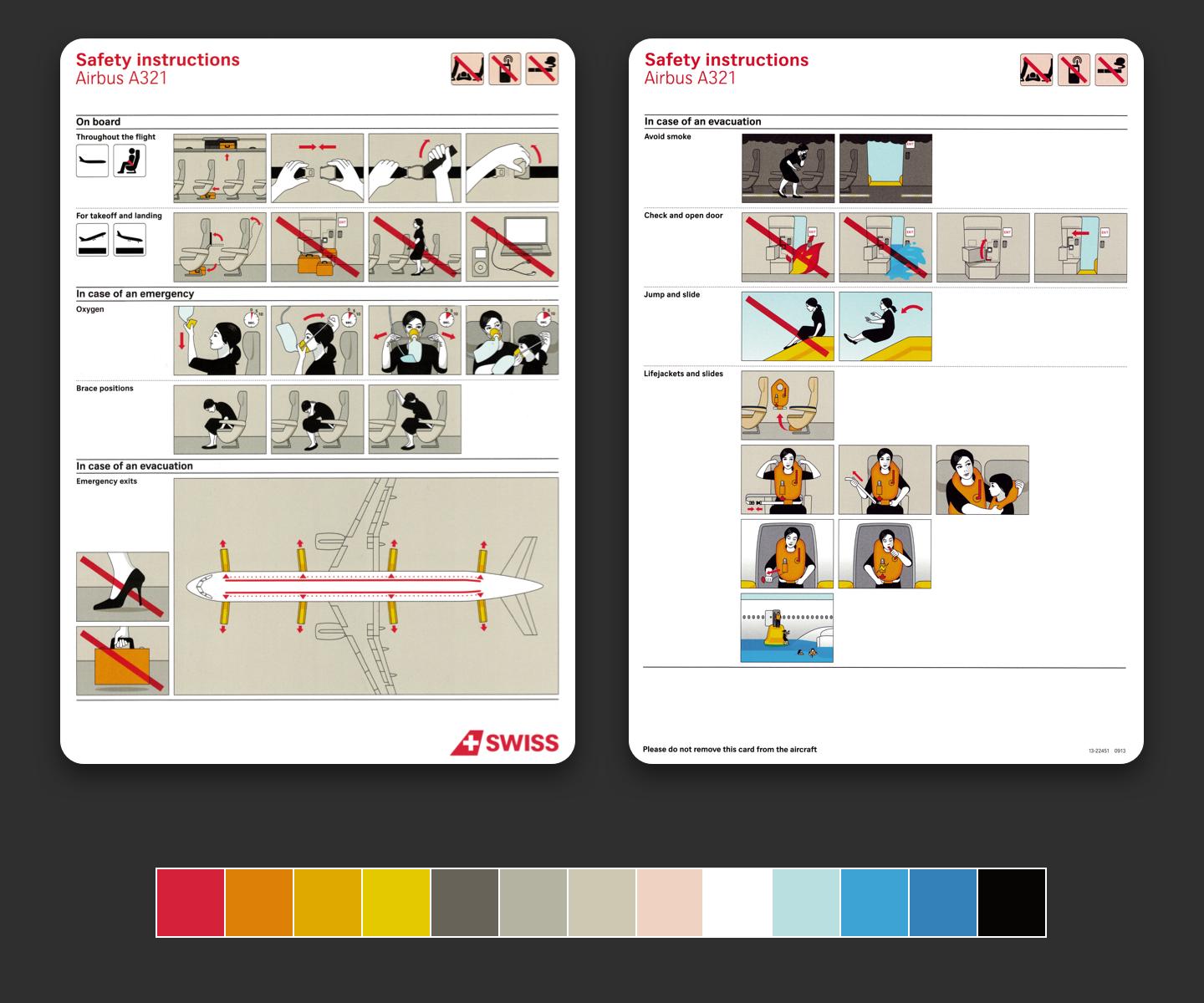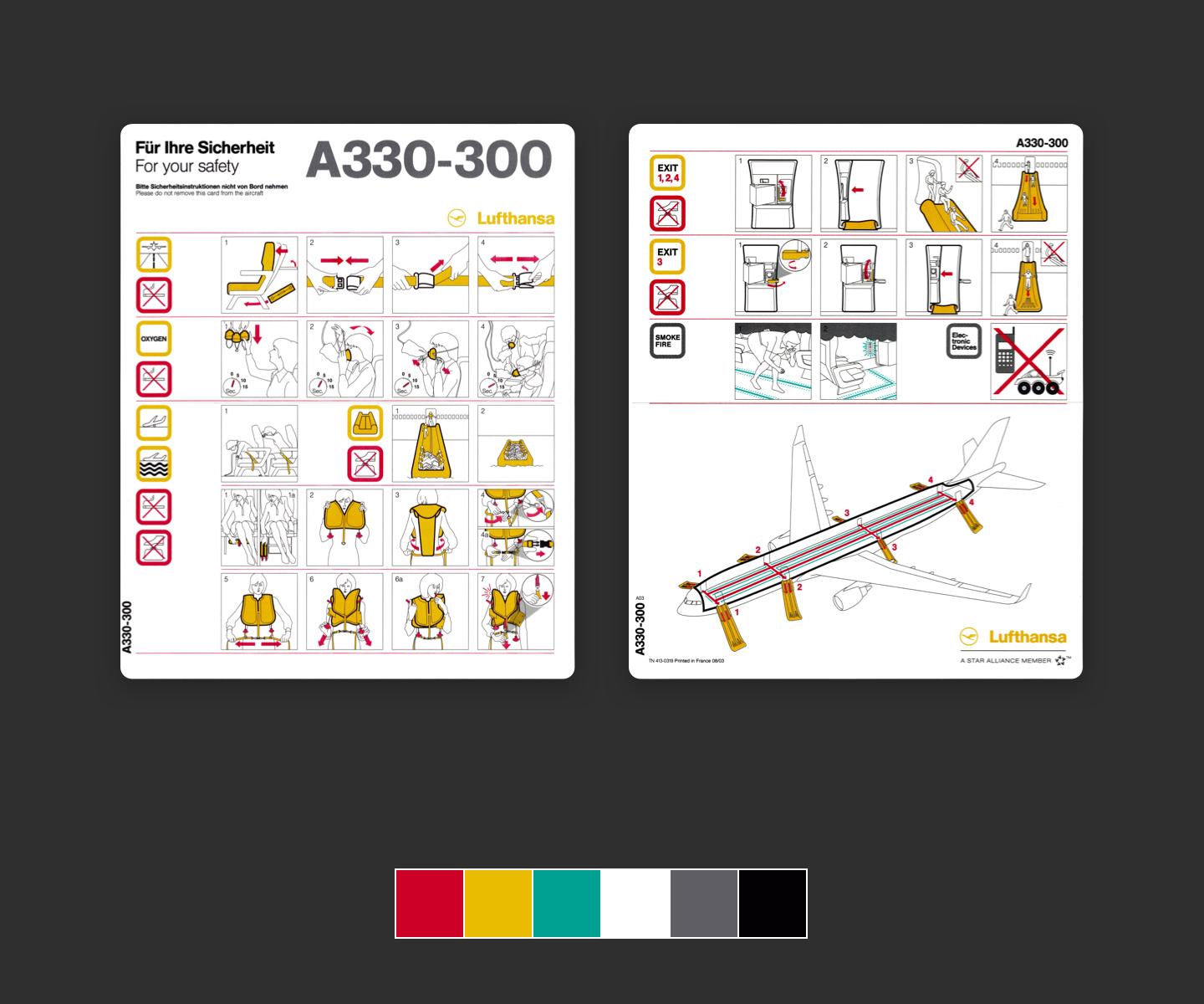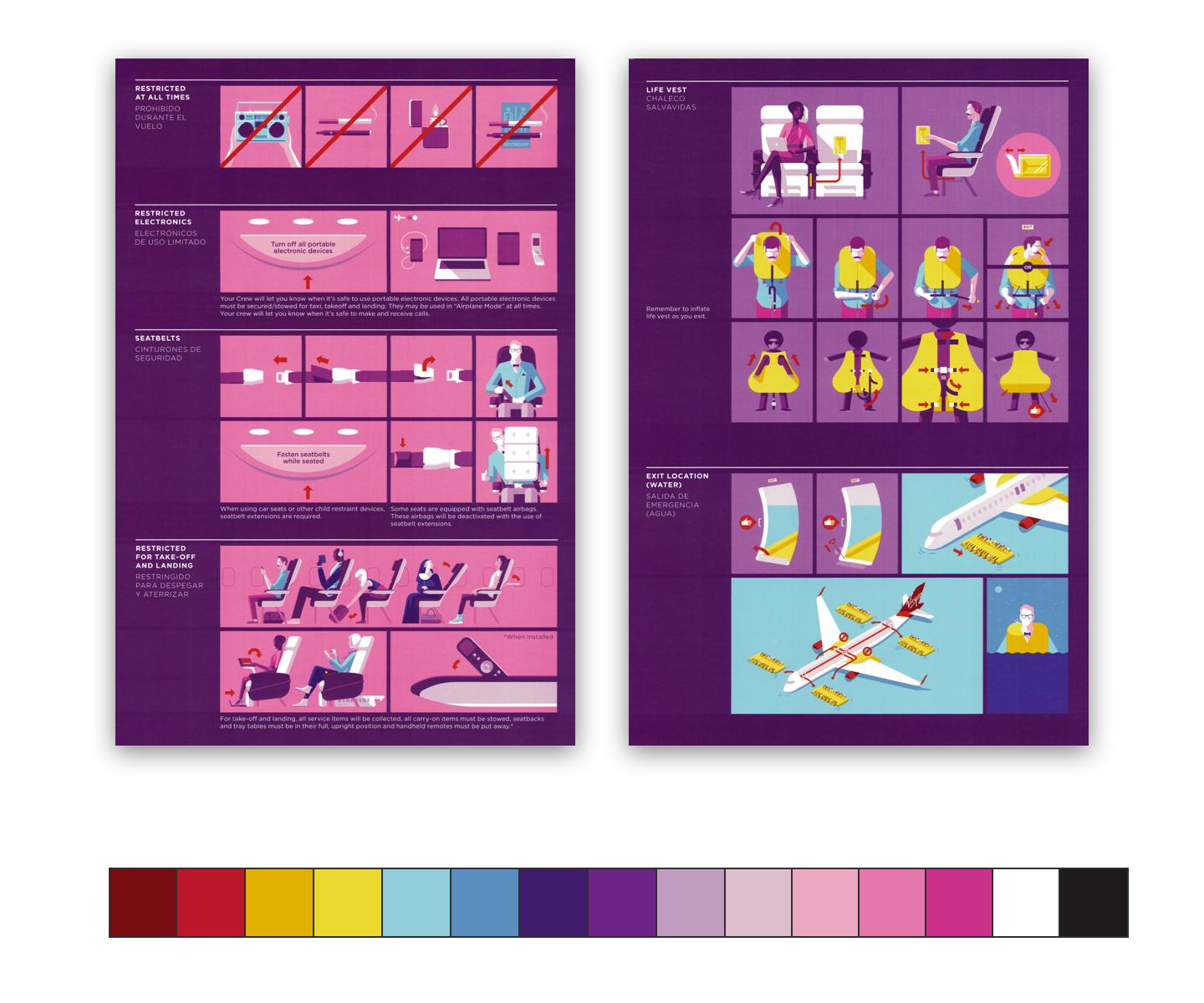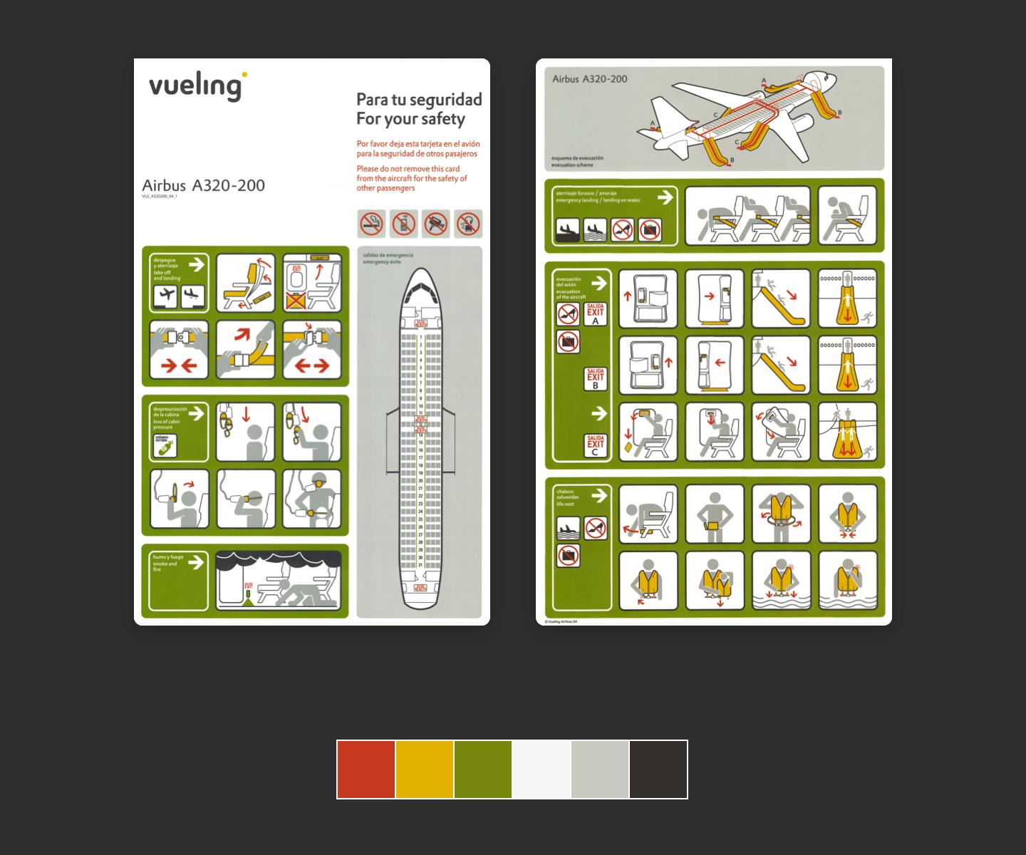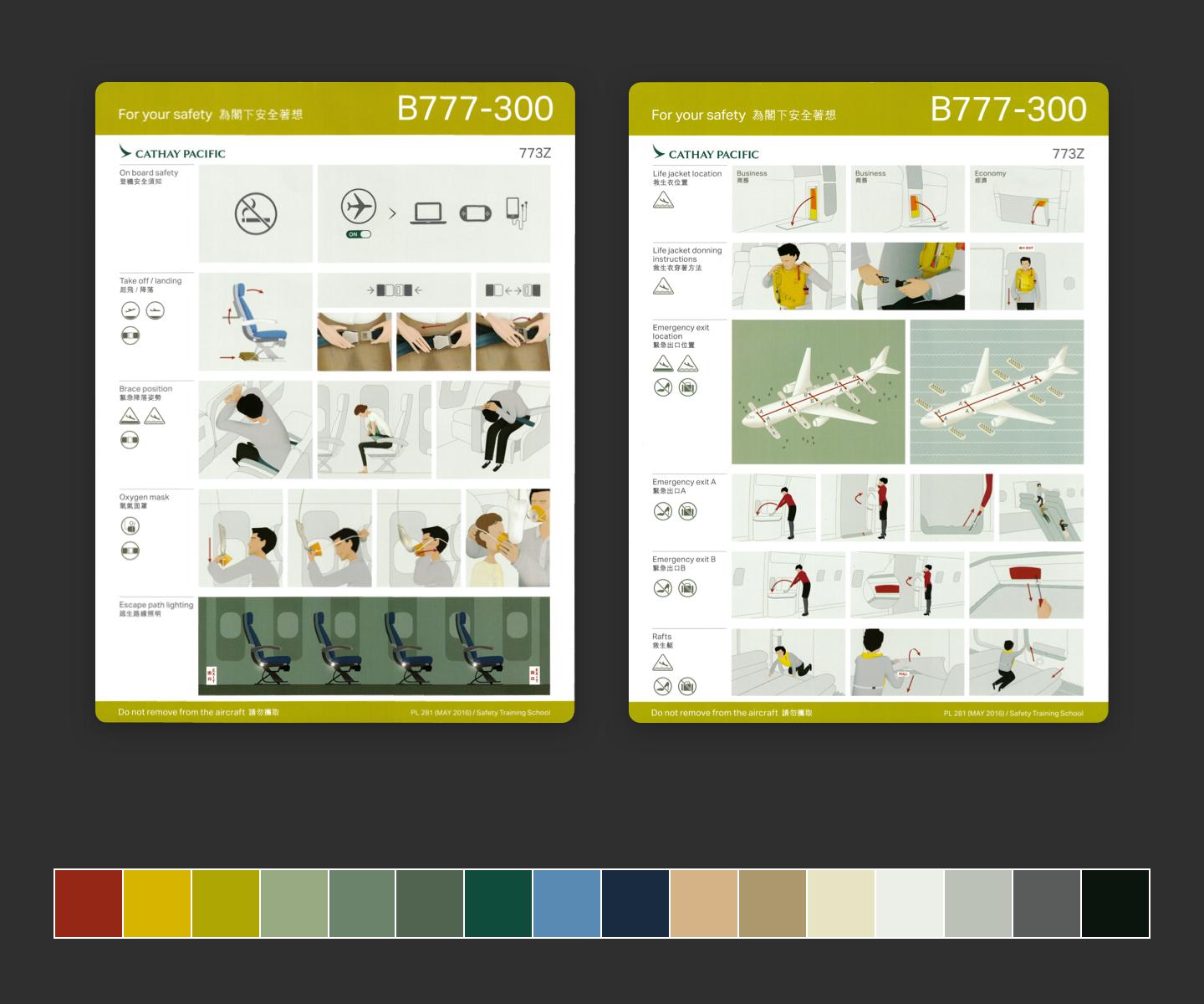 Aircraft safety cards, not only use color to tell stories and convey meaning but use color to carry their respective brands.
