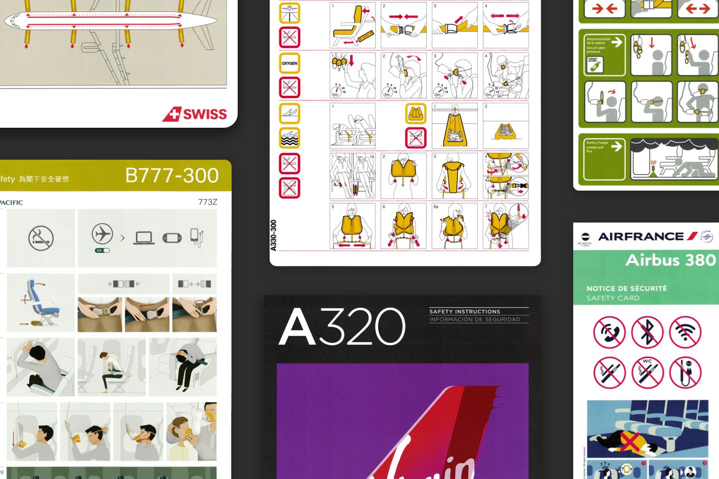 And there we see the variety of different aircraft safety cards I’ve found. They must all conform to a set of universal requirements. They have to fit in a seatback pocket. They should be comprehensible by anyone regardless of their locale.