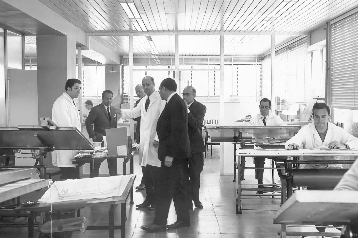 Gabriel in a white coat leading a tour of the Braun Española offices