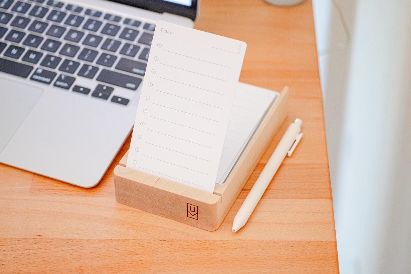 Following the standard 3” x 5” index card size, the cards are beautifully crafted with a line for the date and ten todos, each with a circle and a single line. There’s a suggested way of using these circles to track progress, but it’s entirely up to the user. A dot grid on the back is the perfect place for notes and sketches. There are also other cards types — Next and Someday — for organizing future work.