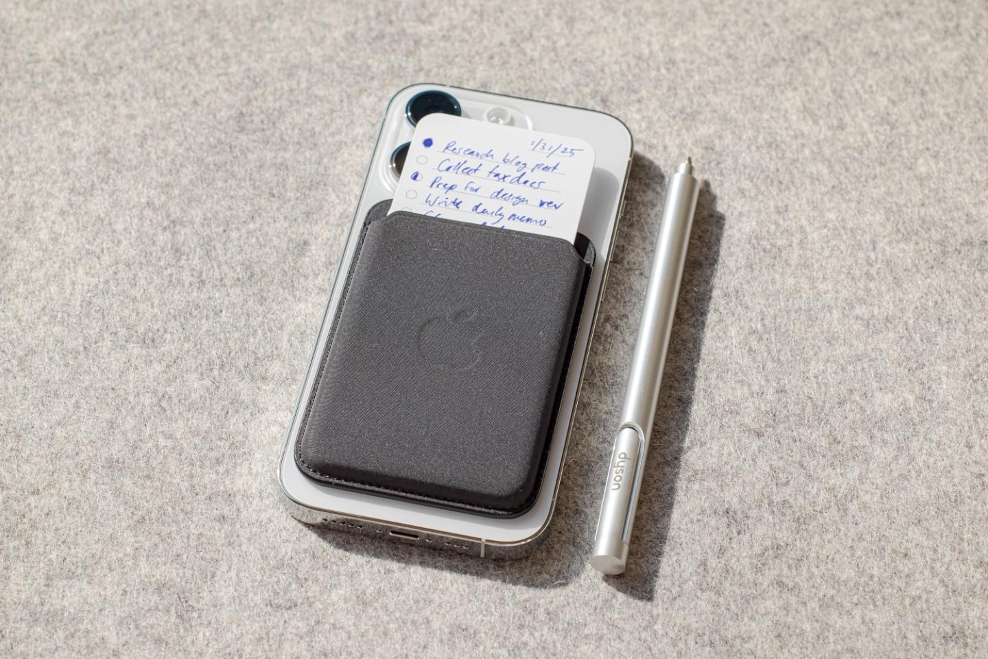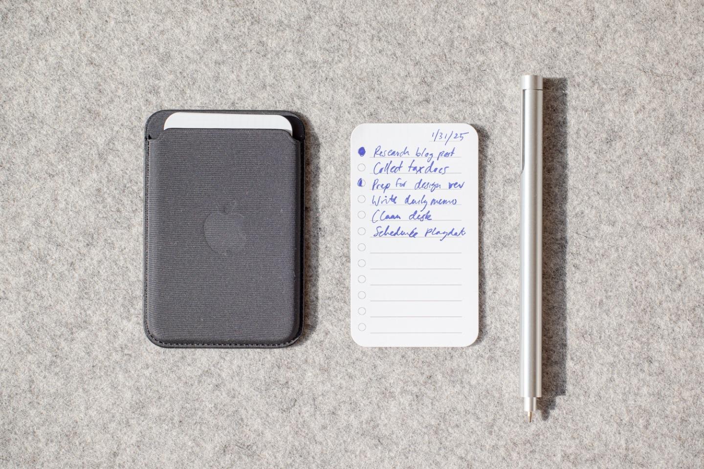 The ritual of sitting down and taking the MagSafe wallet off my phone to access my todo list marks the transition into focused work. This single list is the meeting point for all my digital lists. Every task ends up on paper.