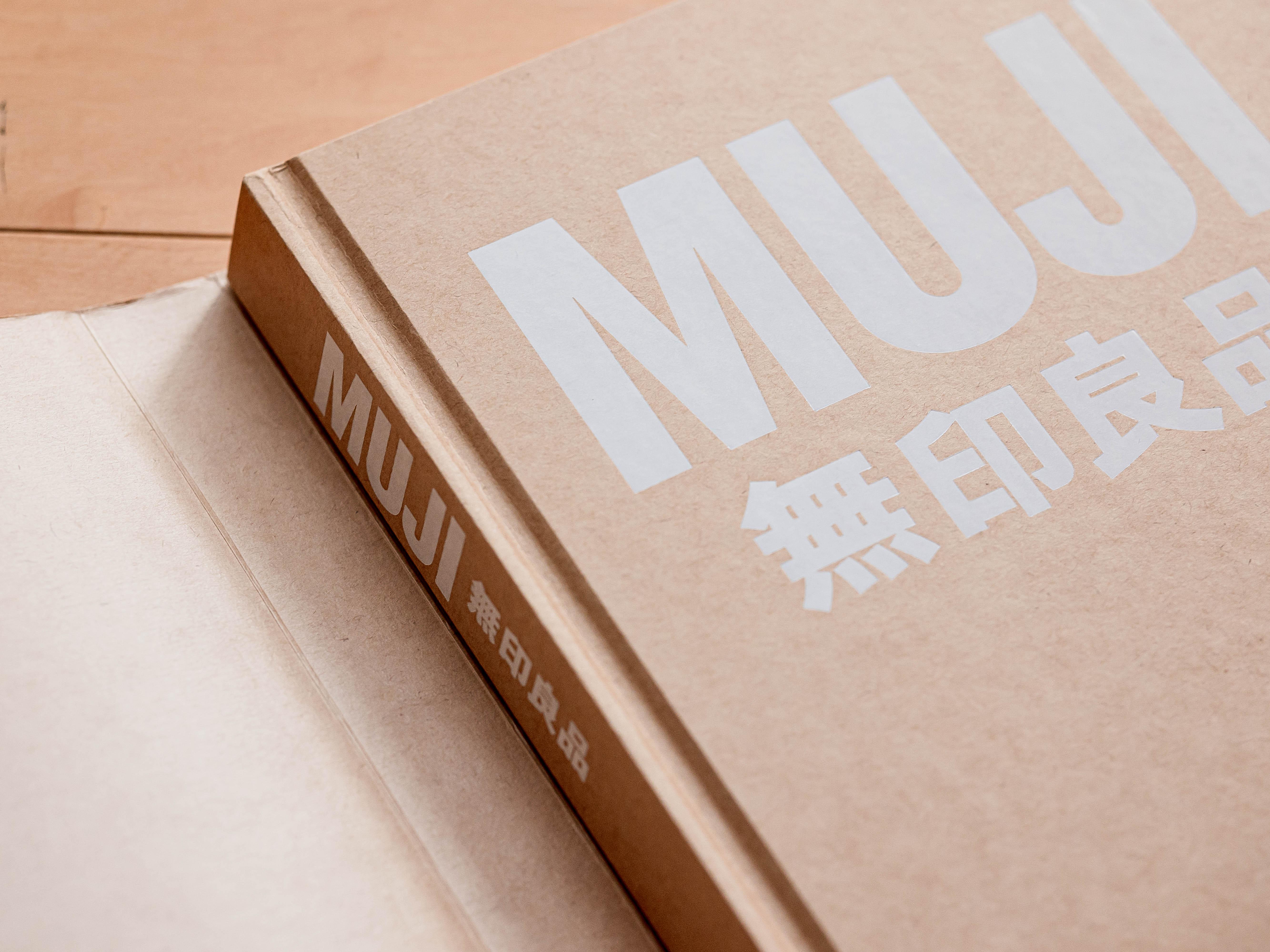 The book looks like a MUJI shopping bag. MUJI, set in a condensed form of Helvetica, appears above 無印良品, both in MUJI’s instantly recognizable maroon color on a kraft brown field. Open the dust jacket and we are greeted with an enlarged version letterpressed into the cover in translucent white ink.