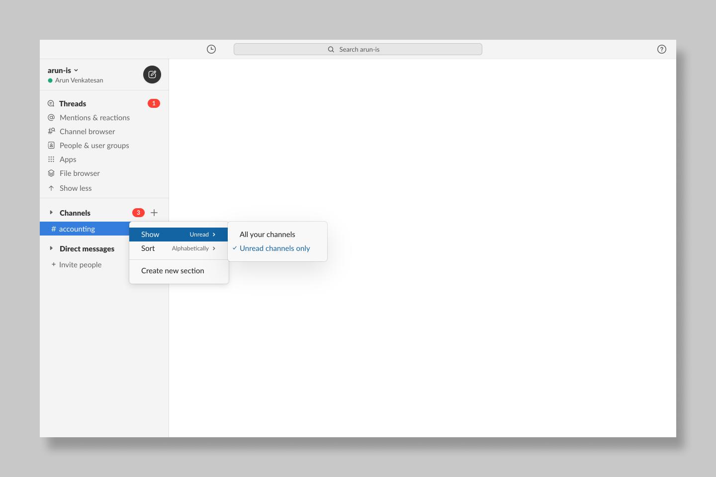 Next, go to the Channels, Direct messages, and Apps sections and switch them to only showing unread messages.