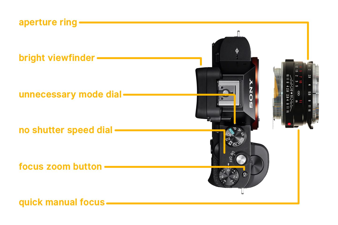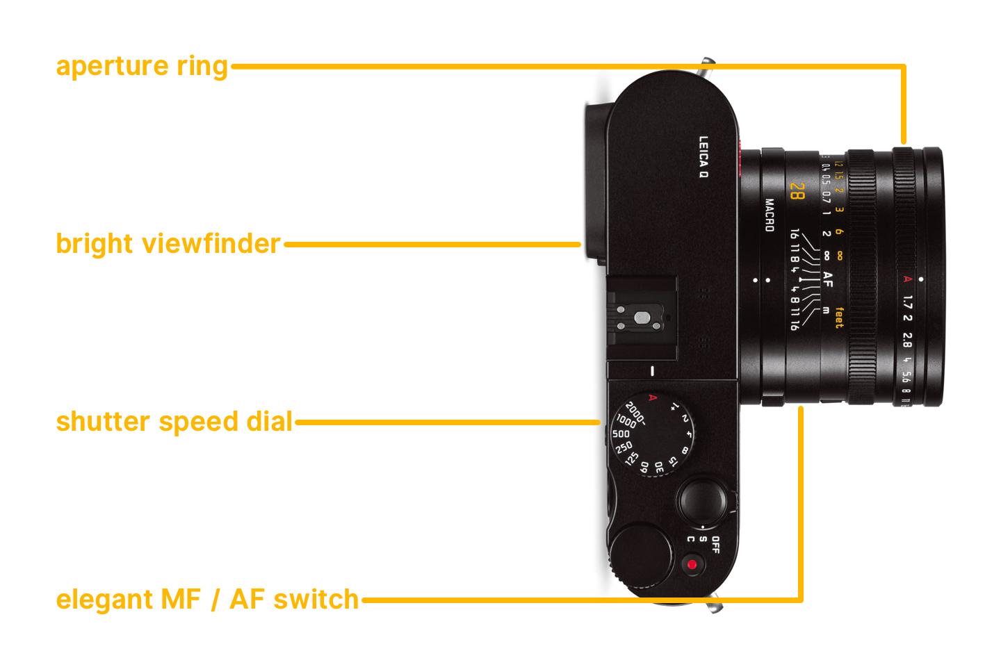 It doesn’t have interchangeable lenses. There is no mode dial. The MF/AF switch is elegantly integrated into the focusing tab. Aperture, shutter speed and macro mode are all controlled by dedicated physical controls.